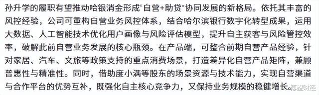 从专业能力角度看,孙升学横跨信用卡运营、风险管控、移动金融的履历,恰好匹配自营业务对获客、风控、技术的综合要求。特别是在风险管控方面,孙升学担任哈尔滨银行首席风险官的经历,对于当前面临资产质量压力的消费金融行业来说尤为重要。