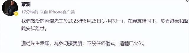 数日前,知名作家蔡澜的社交账号更新了一则讣告。