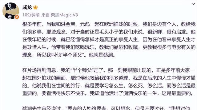 在成龙发布的文章中,他表示蔡澜的观念让他受益匪浅,还称蔡澜是他的“半个师父”。