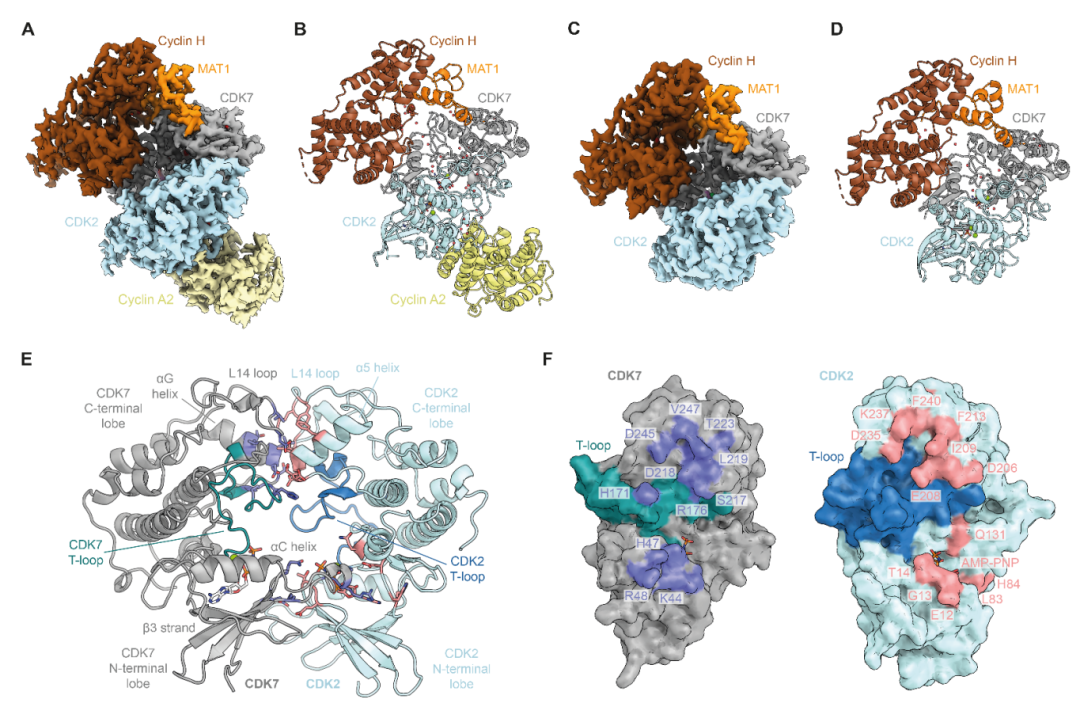 图1. CAK-CDK2-cyclin A2 及 CAK-CDK2 复合物的冷冻电镜结构