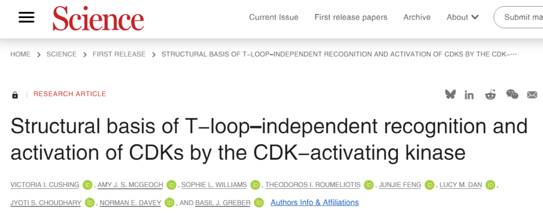 近日,英国癌症研究院BASIL J. GREBER等人通过解析CDKs与其激活激酶(CAK)复合物的三维结构,揭示了一种不依赖于CDK上保守T-loop结构域的、前所未有的激活机制。该研究以“Structural basis of T-loop–independent recognition and activation of CDKs by the CDK-activating kinase”为题发表在《Science》上。