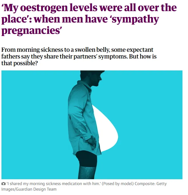 [1]Atkins L. My oestrogen levels were all over the place: when men have sympathy pregnancies [Internet]. London: Guardian News & Media; 2019 [cited 2026 Jan 23]. Available from: https://www.theguardian.com/lifeandstyle/2019/jul/22/my-oestrogen-levels-were-all-over-the-place-when-men-have-sympathy-pregnancies.