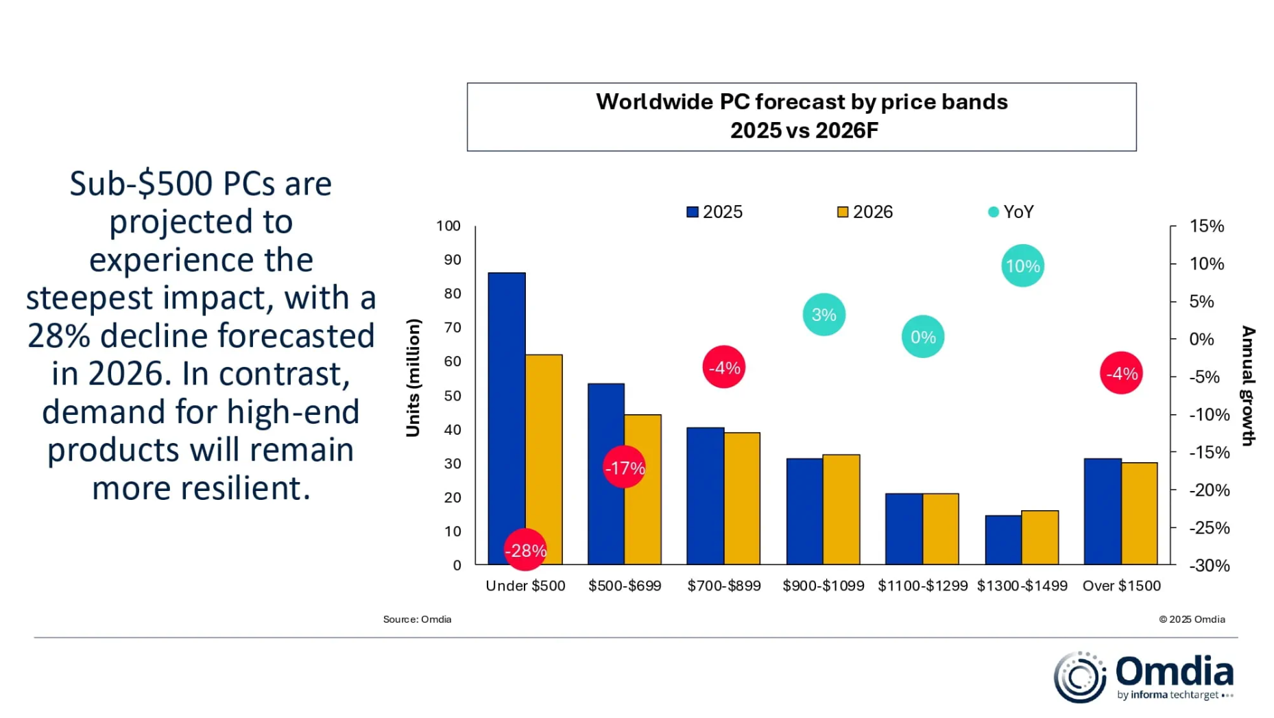 报告分析,自2025年下半年以来,DRAM与NAND Flash等存储芯片的供应短缺问题日益严峻。上游晶圆厂产能调整、原材料成本上升以及地缘政治等因素叠加,使得内存模组与固态硬盘的价格持续走高。Omdia认为,这部分成本压力将直接传导至PC整机制造商,迫使品牌方提高终端售价或削减订单,最终拖累整体出货表现。