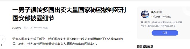 3. 一男子辗转多国出卖大量国家秘密被判死刑 国安部披露细节 央视新闻 2025-03-19