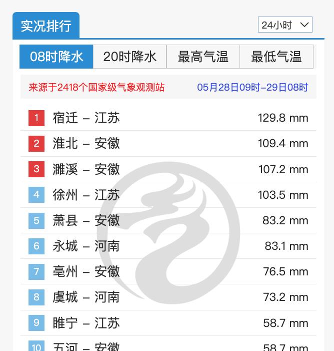 比如5月29日,还能看到雨带异常的迹象——5月28日-5月29日,雨带重点继续落到黄淮地区,豫东苏北昨夜今晨普降大到暴雨,其中宿迁淮北濉溪和徐州出现大暴雨。
