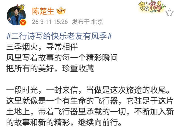 歌手陈楚生在北京发文,三行诗写给快乐老友有风季!令人感动不已!