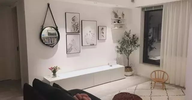 电视墙没有安装电视机,而是以一排储物柜和装饰画取而代之,简约中透露着家的温馨。百叶窗帘和白色纱帘的搭配,可以根据光线的需要进行调节,让室内光影变化充满了生活的韵律。