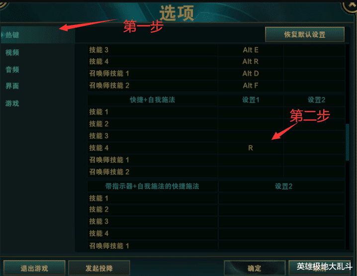设置-热键-英雄技能和召唤师技能-点开往下拉找到“快捷+自我施法”,把技能4设置1设置为R。