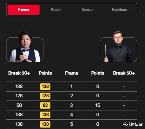 本场比赛的五局比分(张安达在前):138-0、128-0、82-15、138-0、138-0,极为悬殊!再加上总局分也是5-0零封,此役张安达狂送5个鸭蛋!总得分之比,则是624-15!希望张安达延续这个状态,因为下一轮的对手,张安达将会面对斯诺克第一人奥沙利文。同一轮次,奥沙利文状态同样火爆,两杆破百(131,103)、三杆50+(93,61,59),以总局分5-1轻松淘汰另外一位中国选手雷佩凡。