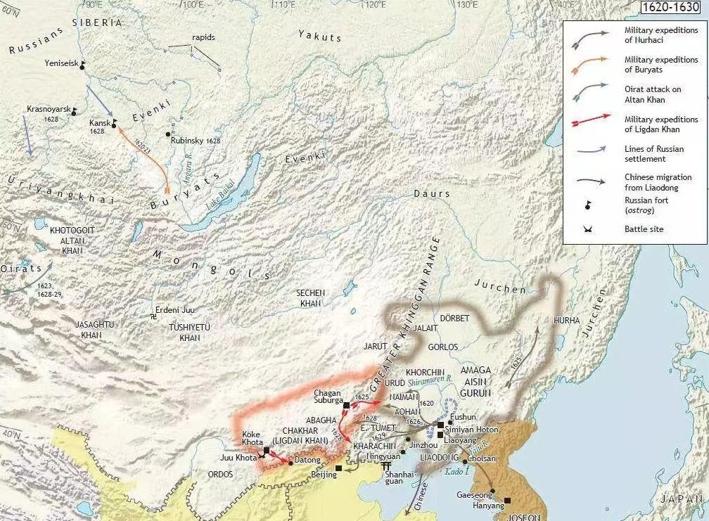 林丹汗去世后,其后代岌岌可危,各部落开始更多投向后金旗帜。