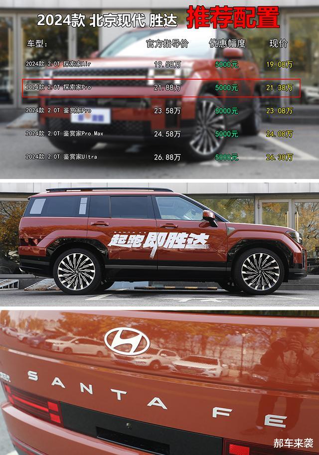 近日,根据郝哥暗访北京地区某北京现代4S店得知,北京现代第五代胜达共在售五款车型,售价区间为19.58万~26.88万元,通过店内获悉,新车目前全系直降5000元,最终通过配置分析并结合优惠情况,郝哥推荐您首选次低配2.0T 探索家 Pro。理由也很简单,首先入门版探索家Air裸车价不到20万,价格则成为了其最大的竞争力,但配置的确有点惨淡,没有天窗,甚至连空调都是手动的,所以郝哥并不推荐购买。