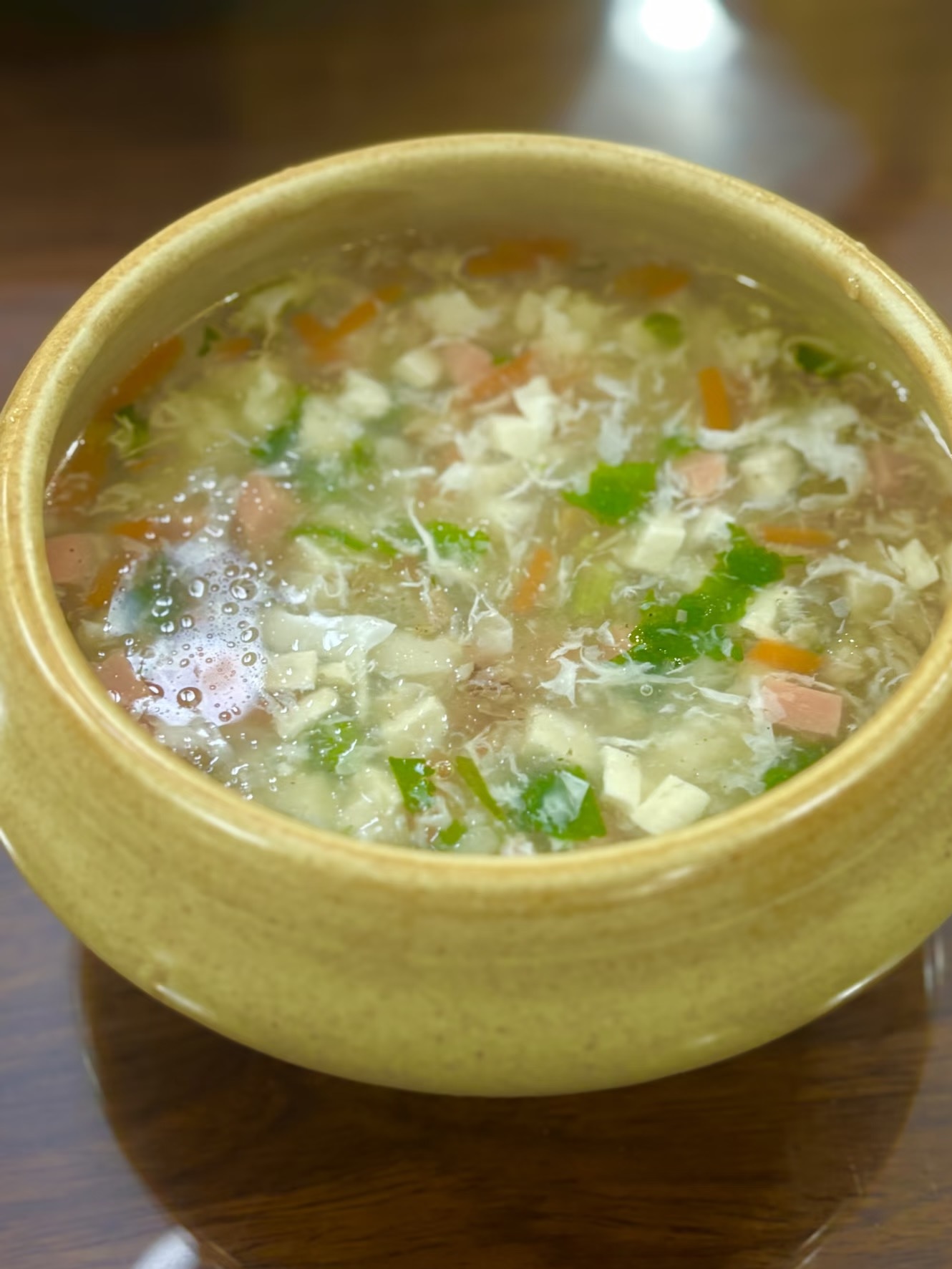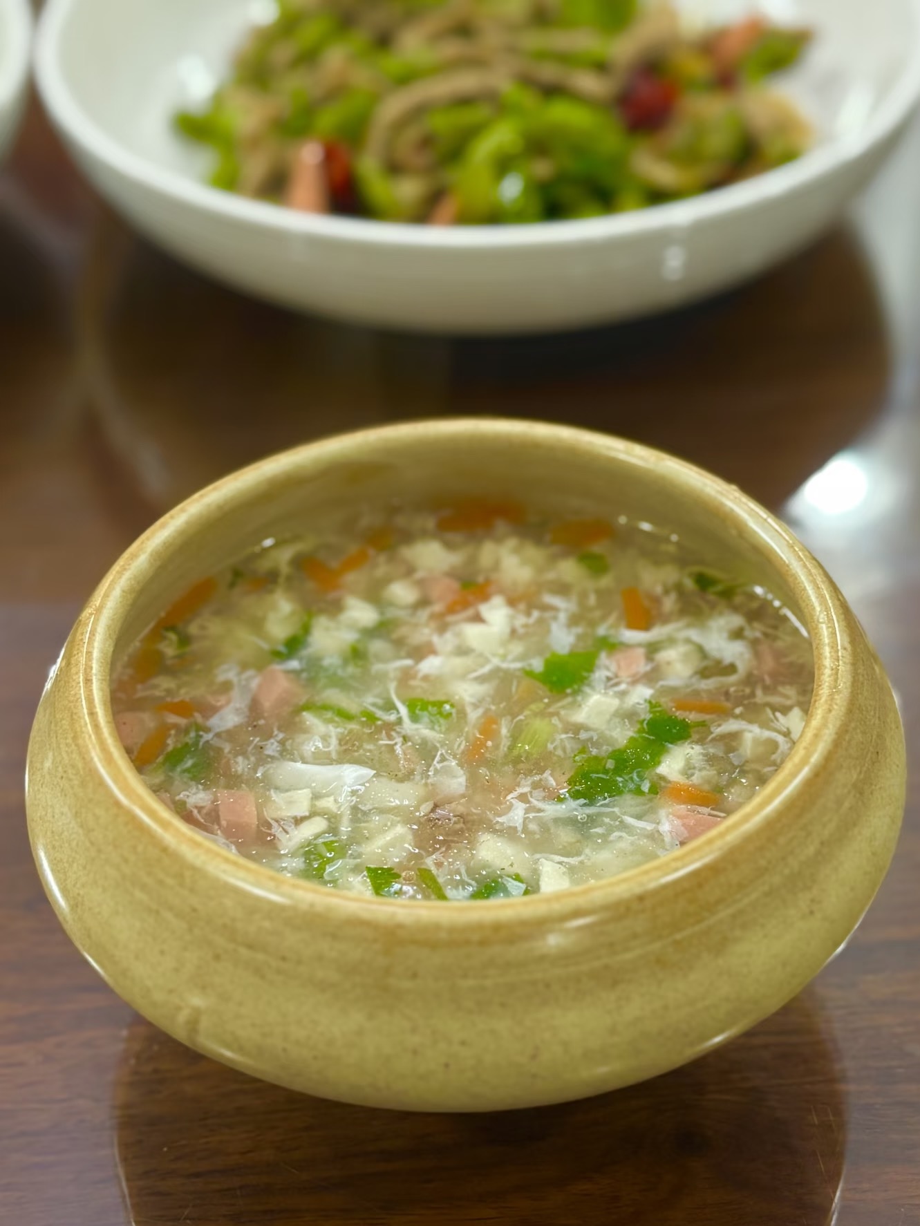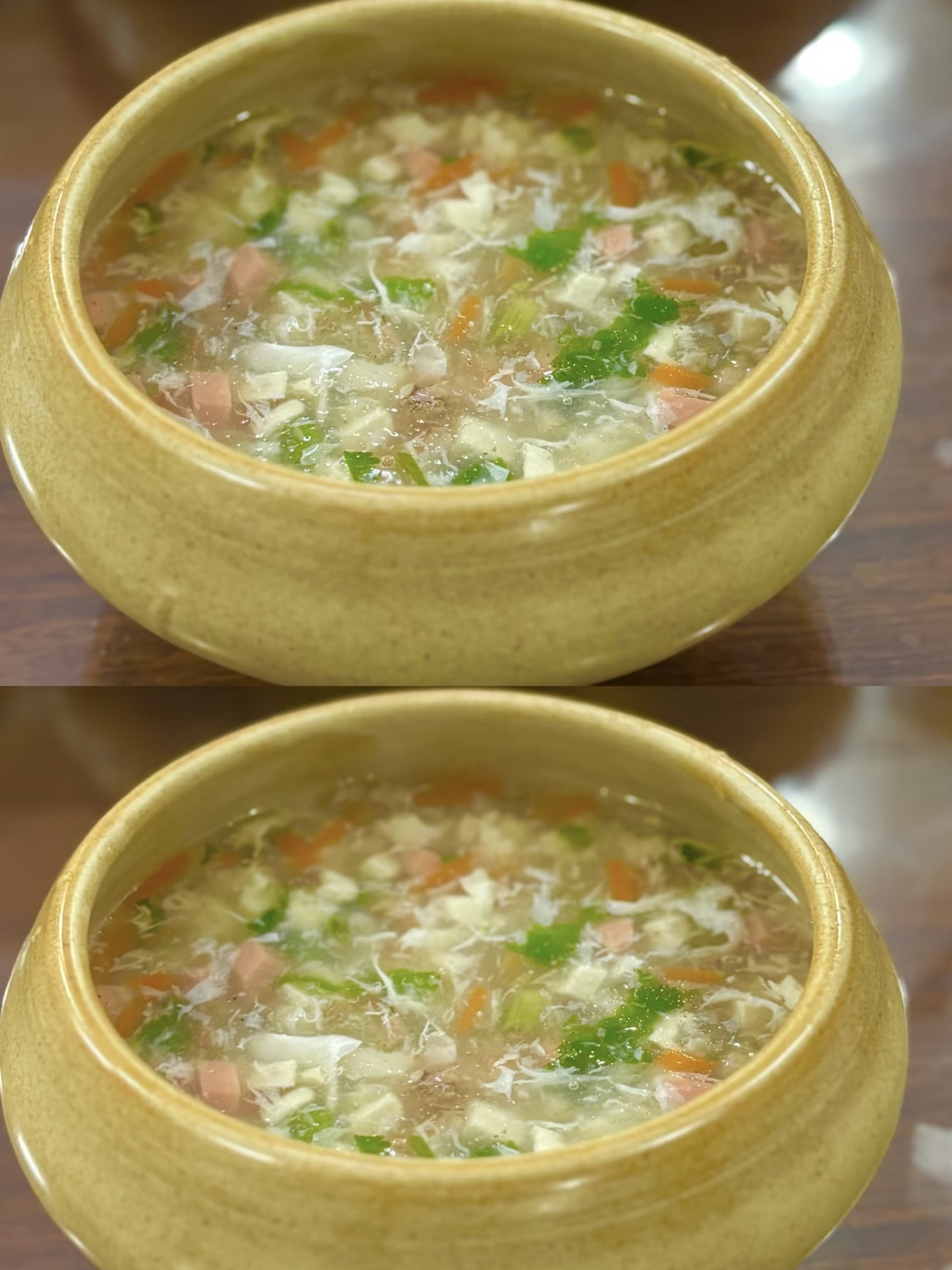 煮好的西湖牛肉羹,汤色浓稠,牛肉嫩滑,蛋花金黄,香菜翠绿,胡萝卜和火腿肠丁点缀其间,色香味俱全。轻轻舀一勺,鲜味在舌尖上跳跃,牛肉的嫩、蛋花的滑、豆腐的软、胡萝卜的甜,完美融合在一起,每一口都是满满的幸福感。