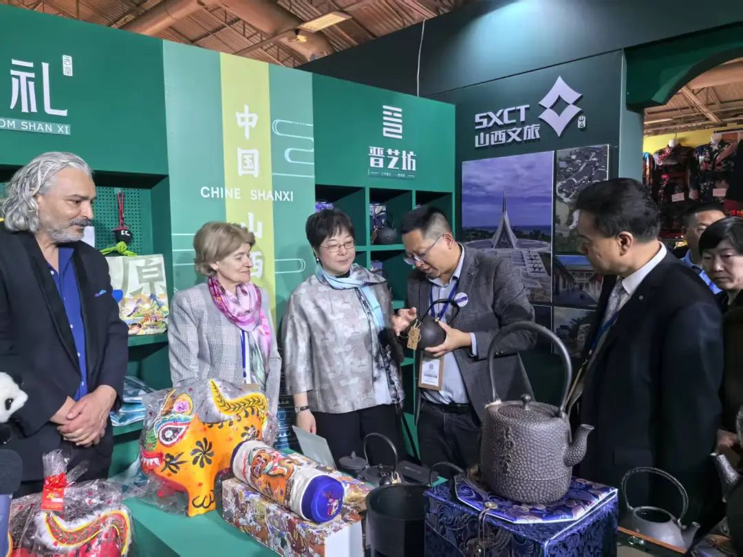 中国常驻联合国教科文组织代表杨新育,联合国教科文组织前总干事 伊琳娜·博科娃到晋艺坊展位
