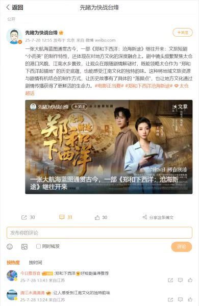 全媒体矩阵强势覆盖,影响力呈几何级扩散—— 《郑和下西洋:沧海新途》不仅在江苏影视频道、中央广播电视总台央视频等平台黄金时段播出,更同步登陆抖音、红果短剧、咪咕视频等头部网络平台,形成“大屏小屏联动、长短视频结合”的立体传播矩阵,极大拓展了剧集的受众覆盖面与渗透力,触达了不同年龄层和兴趣圈层的观众。《中国新闻周刊》、《中国日报网》、《荔枝新闻》等逾300家中央及地方主流媒体、行业媒体纷纷进行专题报道或深度评论,使其影响力从线上娱乐延伸至社会文化层面,广受各界好评。