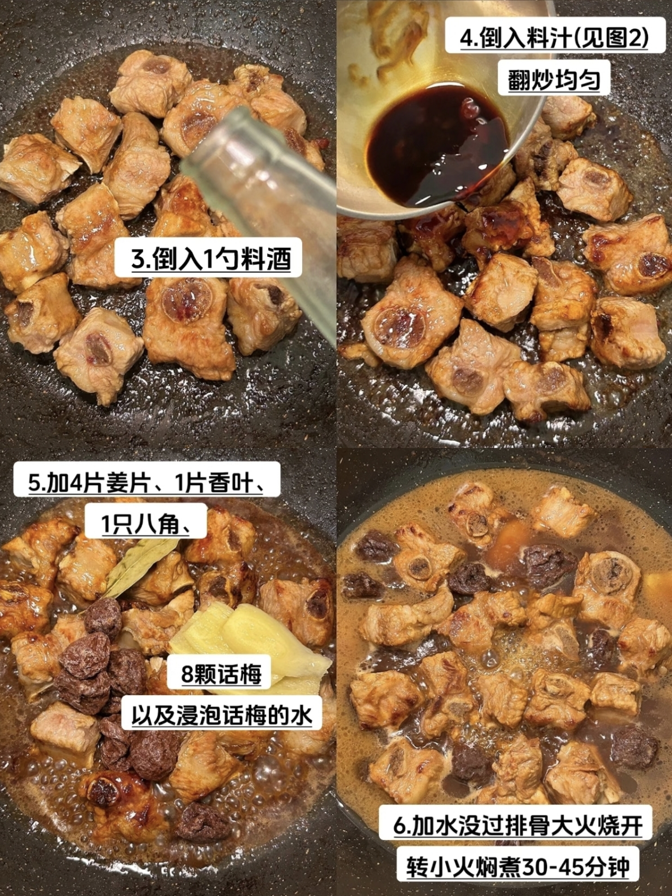 待糖色裹匀,倒入一勺料酒翻炒,酒香瞬间驱散了残留的腥气,接着淋入调好的料汁——两勺生抽提鲜、半勺老抽上色、一勺陈醋增酸、一勺蚝油裹住鲜味,酱汁与糖色交融,在高温下翻腾出浓郁的香气。此时加入姜片、八角、香叶,连同泡软的话梅和那碗浸满果香的温水,再添清水没过排骨,大火烧开后转小火慢焖,30到45分钟的等待里,话梅的酸甜、香料的醇厚与肉香慢慢融合,厨房渐渐被温润的香气填满,连空气都变得软糯起来。
