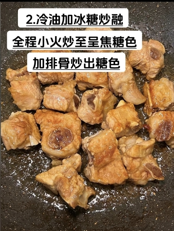 炒糖色是话梅排骨的关键一步,也是考验耐心的细节。锅中倒入少许冷油,放入冰糖后全程小火慢熬,看着晶体渐渐融化成琥珀色的糖浆,再慢慢熬成深褐的焦糖色,气泡细密翻涌时,便是下排骨的最佳时机。沥干水分的排骨入锅,热油与糖色瞬间碰撞,发出滋滋声响,快速翻炒间,每一块排骨都裹上了温润的糖衣,色泽变得红亮诱人,这一步不仅赋予了排骨诱人的卖相,更让甜味渗透进肌理,为后续的酸甜平衡埋下伏笔。