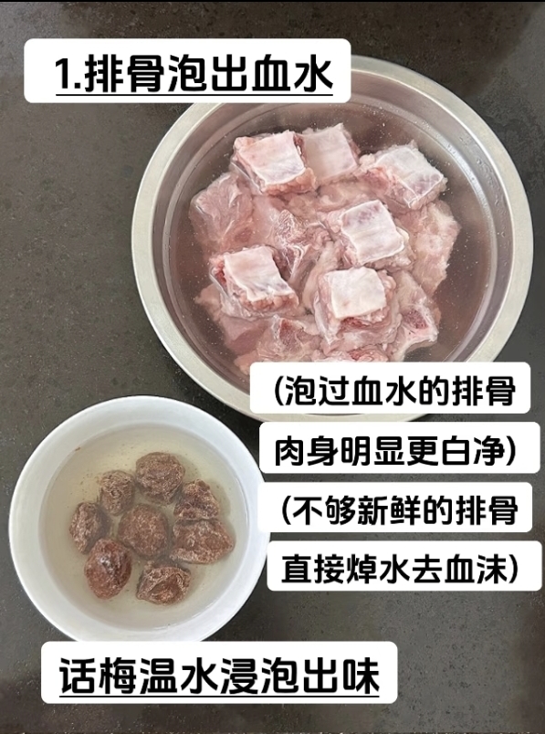 新鲜排骨是成就这道菜的基础,无需复杂焯水,清水浸泡便是最温柔的去腥方式。将450克排骨剁成均匀小段,浸入清水中静置半小时,待暗红血水缓缓析出,排骨的肉身便会变得白净通透,这一步既去除了腥膻,又最大程度锁住了肉质的鲜嫩。若遇上不够新鲜的排骨,也不必慌张,冷水下锅煮沸,撇去浮沫后捞出,同样能为后续烹饪打好基础。另一边,8颗话梅用温水浸泡,待褶皱的果肉慢慢舒展,酸甜的果香便悄悄融入水中,这碗泡话梅的温水,是整道菜风味的灵魂伏笔,姜片、八角、香叶洗净待用,简单的香料为肉香铺垫了层次。