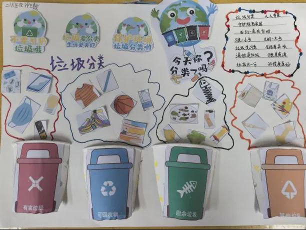 分类整理是数学思维的基石,也是生活实践的利器。二五班周梦甜、雷泽、祁瑾雯、张亦婷巧妙将这一思维用于生态环保,制作立体手抄报,清晰标注四类垃圾桶,生动融合文字与绘画。张亦婷笔下可爱的动物仿佛诉说着“绿水青山就是金山银山”。作品以童趣传递环保理念,在严谨中彰显思政育人价值。