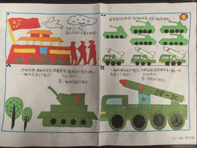 红旗漫卷新时代,战车生辉映日开。二一班陈礼熙、杨子轩、杨子默以“2025年国庆”为主题,绘就天安门、五星红旗与新型战车、导弹等国防成就。他们从数学视角出发,计算升旗时长、战车列数、国旗方阵构成,并通过年代推算重温抗战胜利节点。在计算与绘图中,国庆化为感知国家强大、理解民族尊严的窗口,数学与爱国情怀交融,厚植家国认同。