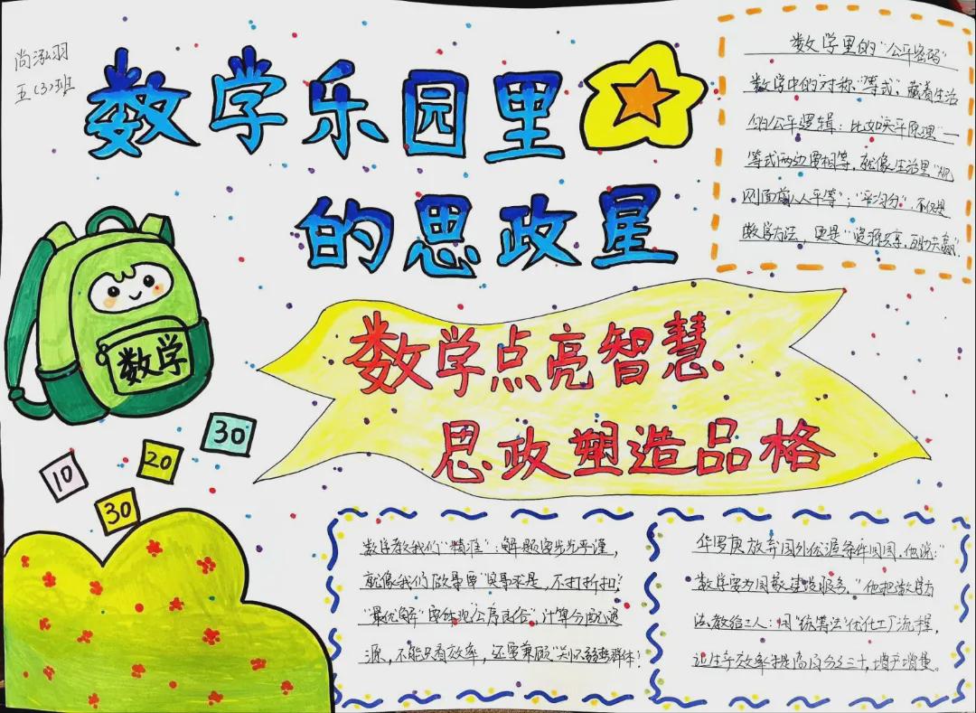 1949年,曾联松设计的五星红旗在开国礼炮声中庄严升起。二九班饶沐桐、王彦旭、芦雨欣受其精神感召,用数学知识为国旗绘就“数字之衣”:测量标注3:2的长宽比例,解读红色象征革命、五星代表团结,并书写爱国心声;手抄报中还绘有白鸽,寓意“新中国是和平的中国”。孩子们以国旗为媒,巧妙融合几何知识与爱国教育,实现数学学习与价值塑造的交融共进。