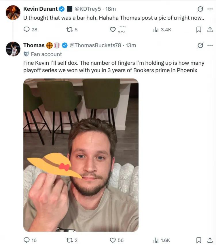 杜兰特近期又在社交媒体上和一位叫托马斯的球迷互怼了起来,还喊话托马斯如果认为自己是个爷们,就发一张露脸的照片。本以为这句话能虎住球迷,结果这位球迷还真的发了自己的照片,并且还竖中指挑衅杜兰特。配文写到这只手指的意思,代表杜兰特在太阳三年和明星队友布克只打进了一次季后赛次轮,这句话可谓是扎心窝子一般。