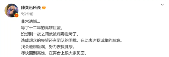 5月15日,演唱会官方微博发布公告,陈奕迅确诊新冠需要休养。高雄三场演唱会延期举行。他发文表示遗憾:"等了十二年的高雄巨蛋,没想到被病毒搅垮了。"他还承诺将遵医嘱恢复健康,尽快重返高雄。明星也是人,和我们普通人一样需要适当休息,歌迷对此应表示理解。