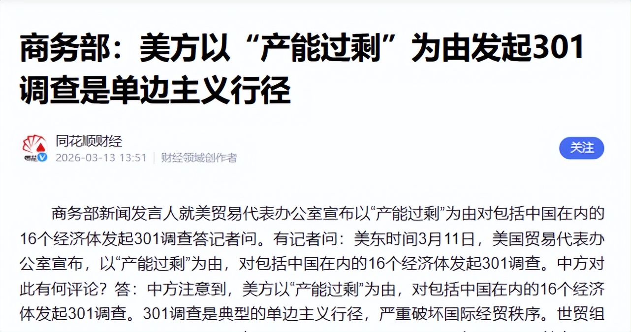 同花顺财经 2026-03-13 美方以“产能过剩”为由发起301调查是单边主义行径
