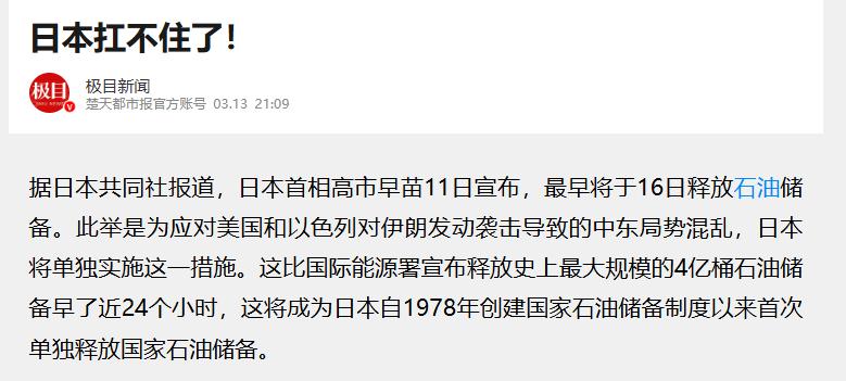 中国新闻网 2026-03-13 单独释放石油战略储备,日本最先扛不住了