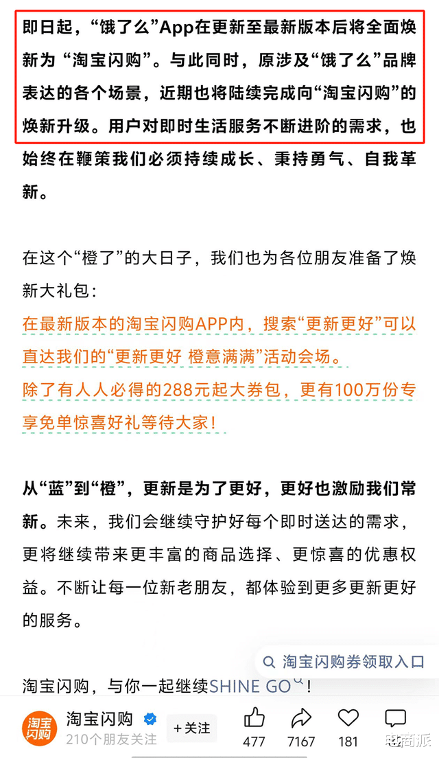 今日,饿了么正式发文宣布:即日起,“饿了么”App在更新至最新版本后将全面焕新为“淘宝闪购”。