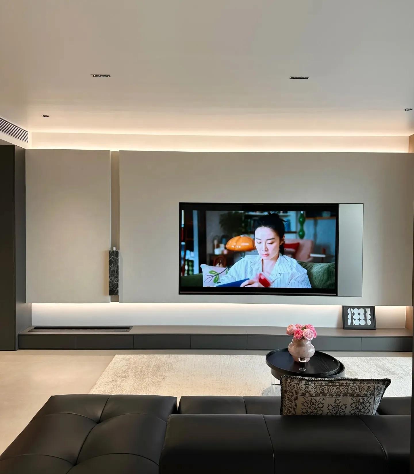 客厅区域电视背景墙简单大气上档次,原来是木工用石膏板做的造型,电视内嵌➕落地电视柜。