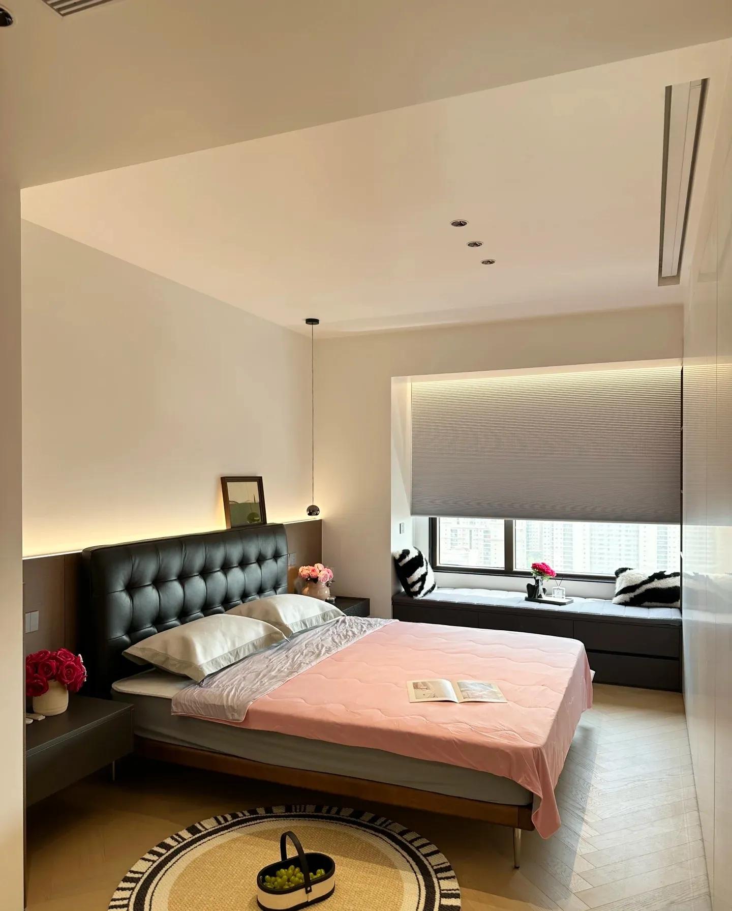 卧室区域卧室区域搭配很温馨的感觉,不少人都直呼漂亮,地面通铺暖色人字拼地板,床头背景墙木饰面上墙做造型。衣柜设计在床尾。