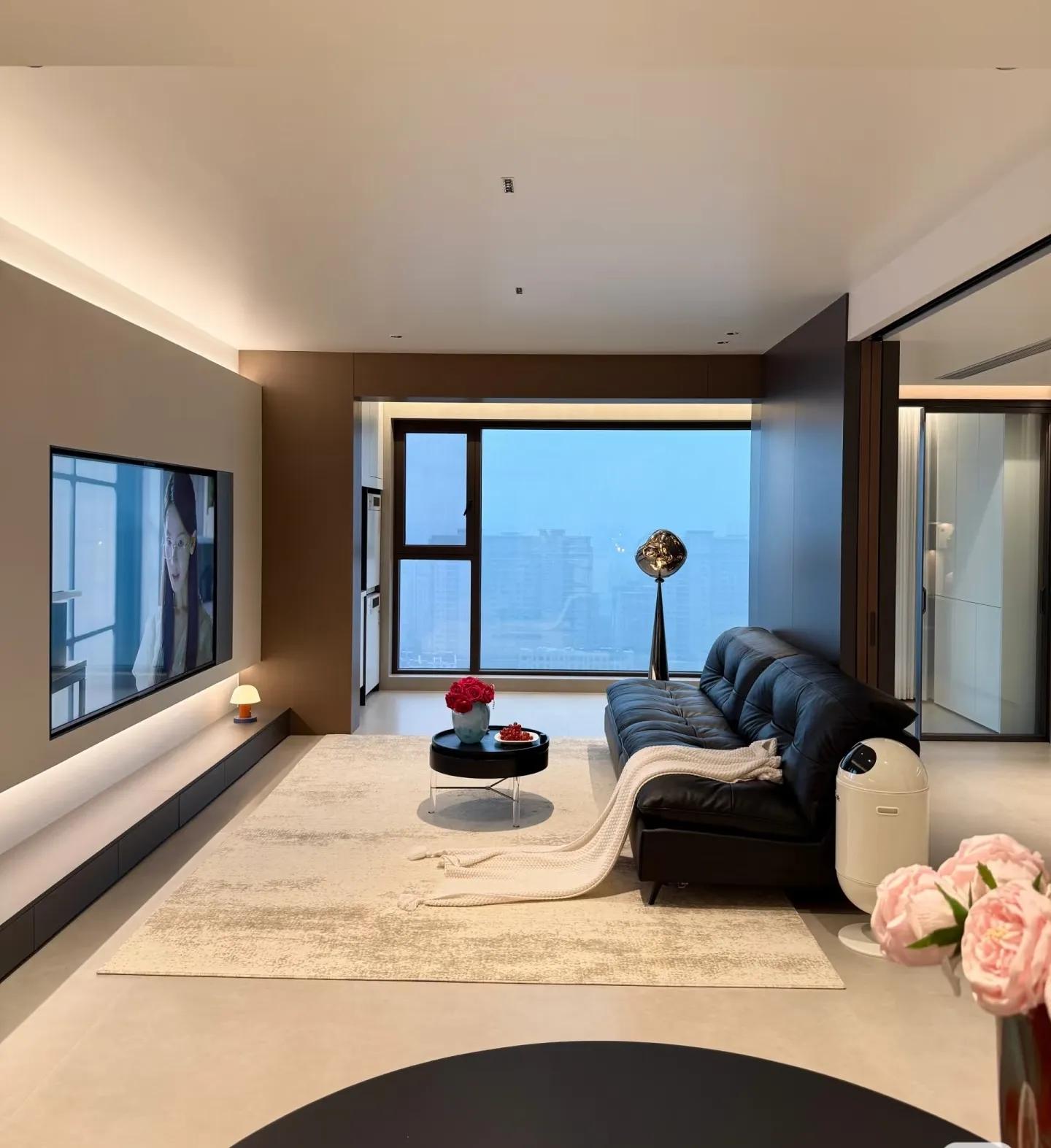 客厅区域的家具我们来简单看一看吧!沙发是深色皮质沙发️,小的圆形○茶几,底下灰色地毯。沙发背景墙木饰面做造型。