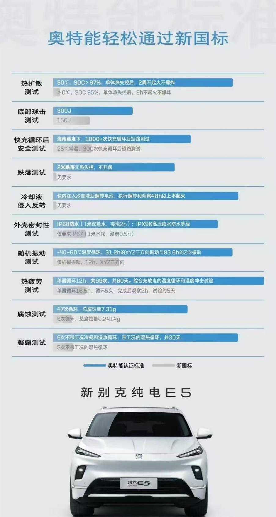 比如别克,快充循环的次数是新国标的三倍以上,热扩散的起始电量更高,观察期还更长;丰田,在底部撞击试验中所用的力度要更大;吉利银河直接用坦克去碾压单块电池。还有小米、极氪、日产、鸿蒙智行等等大厂,都提前达到了新国标对电池安全的要求。