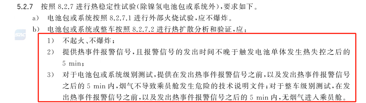 现行国标,要求的是热失控引起危险前的5分钟,发出警报,新国标是在此基础上,既要不起火不爆炸,还要在发出警告的5分钟内,烟气不能对乘员舱造成危险。所以新国标的难点在于,考验电池的隔热材料、结构阻隔和冷却系统这几样加起来,有没有阻止热失控蔓延的能力。