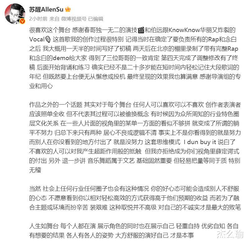 在这篇发文中,苏醒先是表达了对舞台的喜欢,紧接着又说了自己的创作过程。