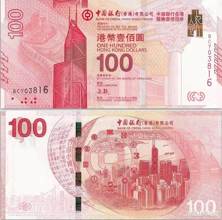 2017年9月25日,中国银行(香港)有限公司又发行了一张“中国银行在香港服务100周年纪念钞”,也叫“中国银行(香港)百年华诞纪念钞” 。