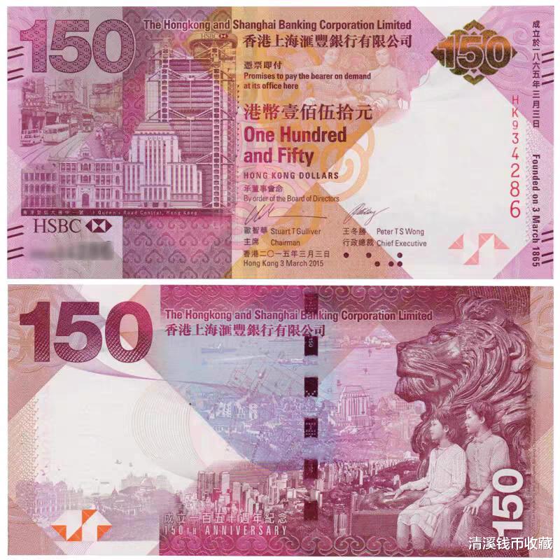 香港上海汇丰银行有限公司1865年在香港成立,2015年,为庆祝汇丰银行成立150周年,汇丰银行发行了“香港汇丰银行150周年纪念钞”,面值为150港元,发行量200万张。