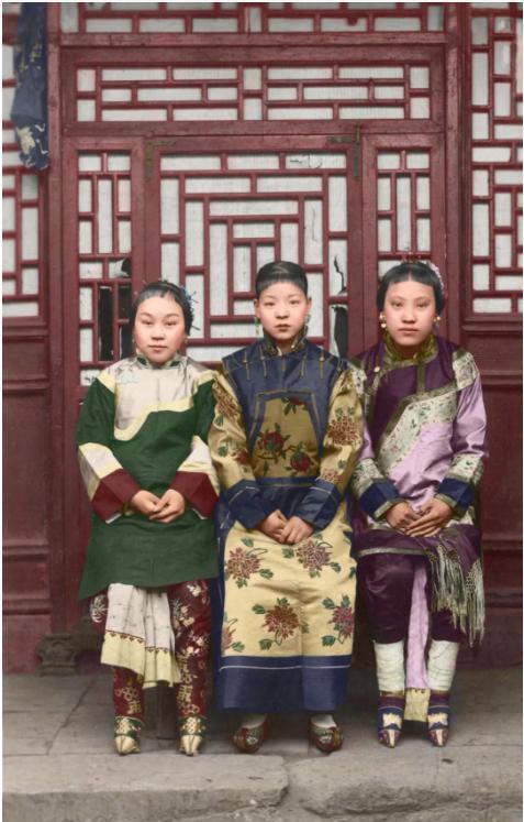 这些少女出身于富裕家庭,她们身着相同的服饰,发型整洁利落。位于中间的那位少女略施粉黛,双唇涂抹着鲜艳的红色,年纪大约在十四五岁左右,然而在当时,这样的年龄往往已为人妇。她们的脚型小巧且相近,从身后那扇不凡的门扉也能窥见她们家庭的不凡地位。