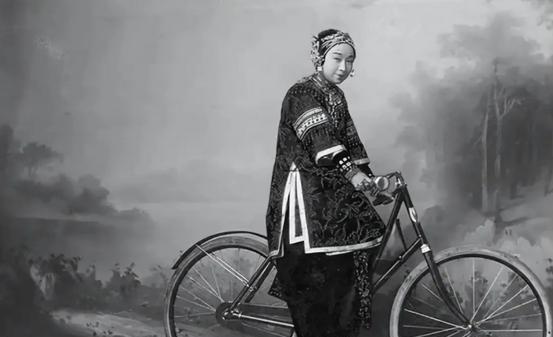 这张照片摄于摄影工作室,一位年轻女子悠然坐于自行车之上。在那个时代,自行车实属稀有之物,众多富裕人士即便有意购买,也难以得手,部分人即便购得,也不擅长骑行。
