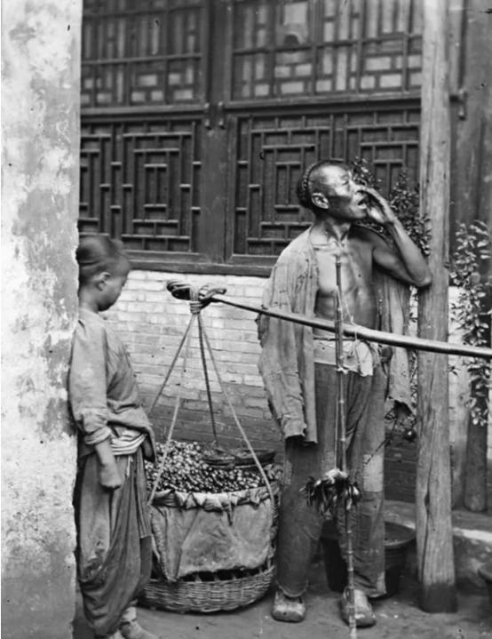 街头小贩高声吆喝,一旁的孩子目不转睛地盯着篮中的点心,对普通家庭而言,购买零食是奢侈之举,能解决温饱已是心满意足。
