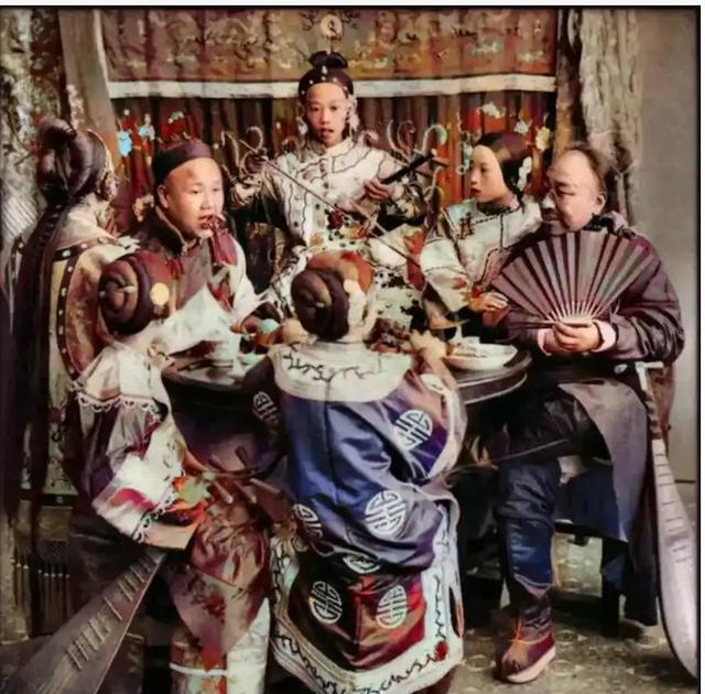 童养媳的命运颇为悲惨,自幼便需离开双亲,步入夫家后生活得如履薄冰。日间如同丫鬟般操劳家务,夜晚还需安抚年幼的丈夫入眠。然而,情况在图中所展现的却大相径庭。观察她们的穿着打扮,显然并非寻常人家,很可能是某位王爷或皇室成员的王妃等尊贵身份。她们的生活细节处处体现着讲究,就连头上的装饰也极为复杂。