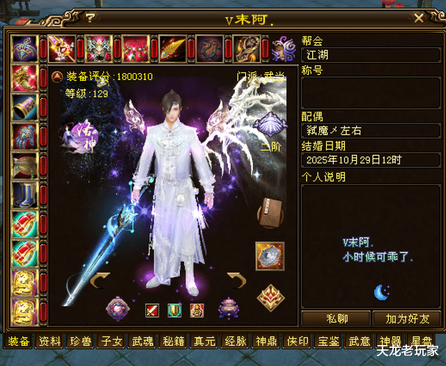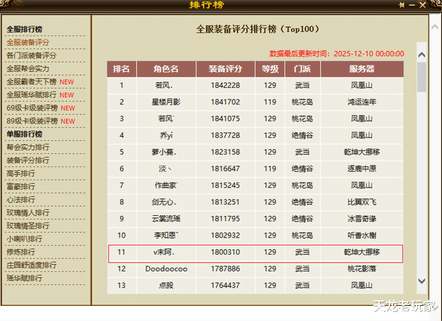 曾经的全服第一,如今已经掉到了11。不过129等级开放之后,V末也是及时更新,终于将这个原天龙第一号评分成功破180万!