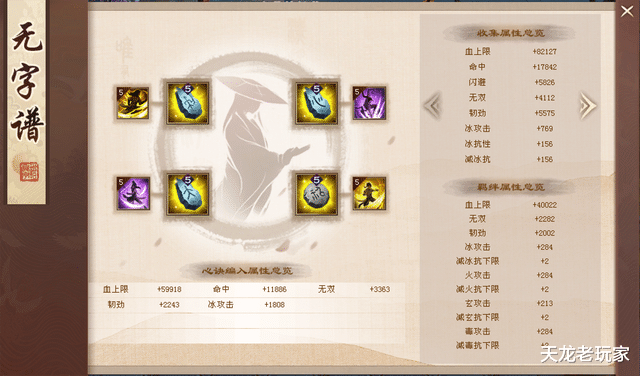 这个号的无字谱选择5级刺心、5级心眼、5级大千、5级神伏,搭配5级大江之势、5级春风江南。