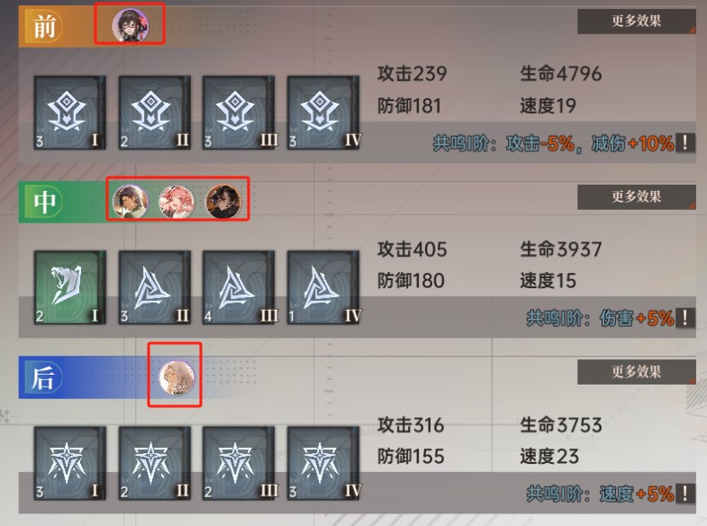 不过,正如下图红框中角色站位所示,属性加成只会给处于相应排的伙伴添加。