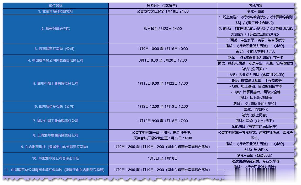 二、招聘高峰期已至!11家单位正在报名,多地有岗从去年10月下旬开始,各省烟草系统就陆续发公告了,现在正处于招聘高峰期,机会千万别错过。已经结束报名的有福建中烟、浙江烟草专卖局等6家单位,没赶上的同学别慌,还有11家单位正在报名。