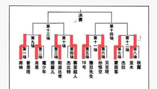 第七、第八场没有悬念,胜出的是蒙面客和亚木,蒙面客就是特兰克斯+孙悟天,亚木是巴菲迪的改造人,另外两人只是普通人,根本不可能是他们对手,所以第一轮的对战情况应该是这样: