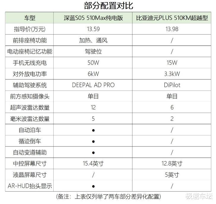 我们拿两台车的纯电次顶配车型:深蓝S05 510Max纯电版和比亚迪元PLUS 510KM超越型,来详细对比一下,看看哪台车配置更丰富?
