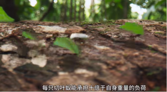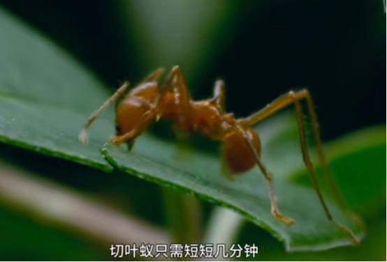 无数的切叶蚁爬上这棵可怜的小树,不由分说切下它辛辛苦苦长出来的叶子,搬运会地底供给给真菌。来来回回的搬运队伍形成数公里地采叶网络,犹如流动的溪流。