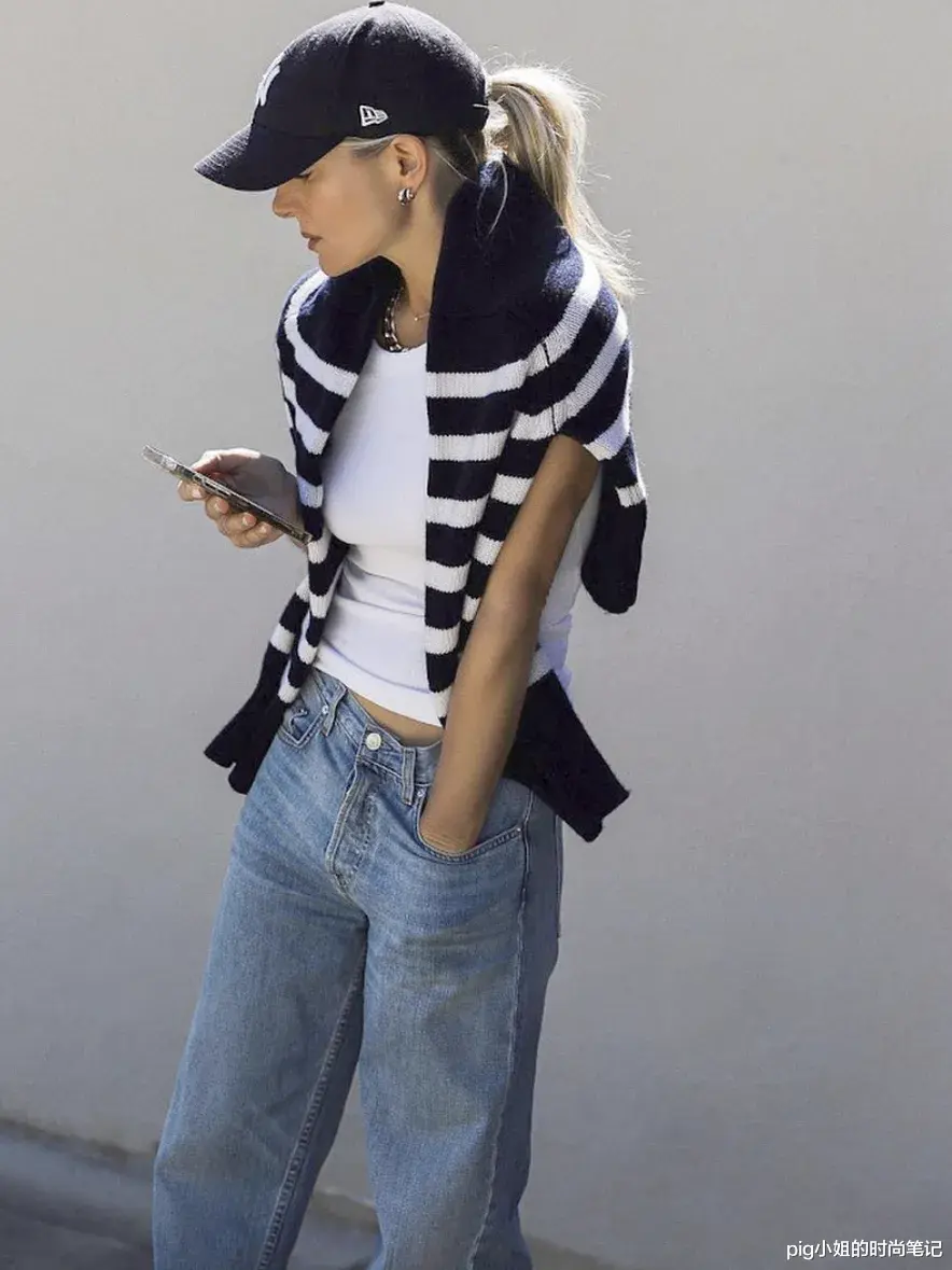 宽松 T 恤配宽松牛仔裤若搭配不当,易显松垮没精神,因此需把握上下身松紧度与整体协调度。