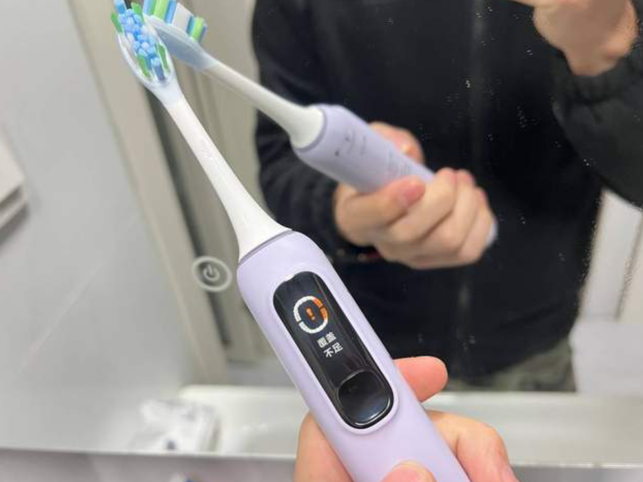 牙刷的开关按钮位于机身中部,采用凹陷设计,手感舒适且不易误触,上方是一块彩色的智能显示屏,会显示当前刷牙档位、刷牙时长、覆盖率、力度提醒、换区提醒、充电提示等信息,确保用户能及时了解刷牙时长和未清洁的区域。